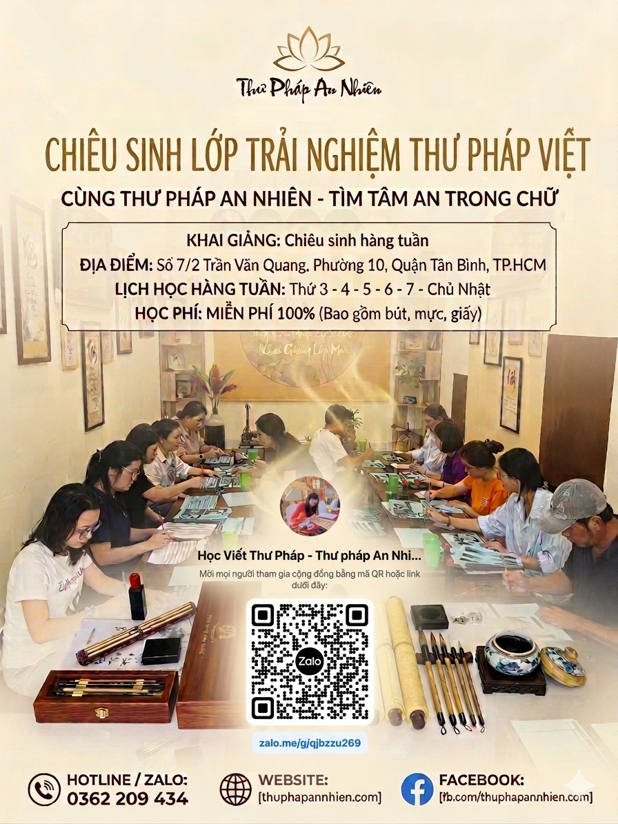 Thư Pháp An Nhiên trân trọng từng nét chữ và từng mối duyên gặp gỡ, hân hạnh đồng hành cùng bạn trên hành trình tĩnh tâm – an nhiên – tìm về vẻ đẹp tinh hoa chữ Việt.